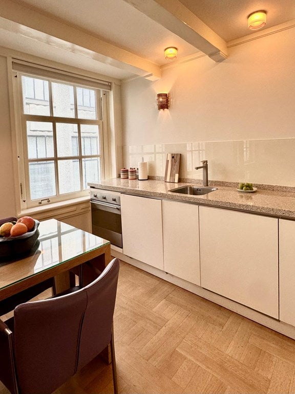Dit stijlvolle en luxueuze appartement met één slaapkamer is volledig gemeubileerd en bevindt zich op de eerste verdieping van een oude weeshuizen in het hart van Amsterdam. Na een uitgebreide renovatie biedt het nu comfort met een open woonkamer en keuken, natuurlijke eiken parketvloeren en ...Overdracht