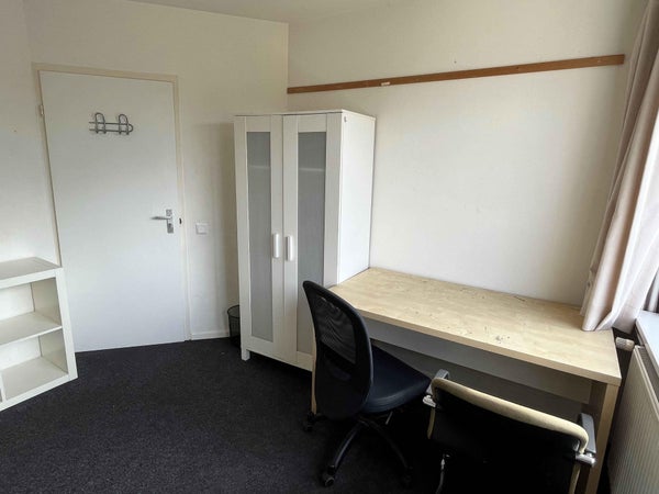 De studentenkamer met wastafel bevindt zich in een gedeeld huis met in totaal 9 kamers. De huurders (allen man) delen 2 badkamers, 2 toiletten, 2 keukens en een wasmachine. De gemeubileerde kamer van ongeveer 13m2 bevindt zich op de 1e etage. De meubilering van de kamer bestaat uit een ...Overdracht