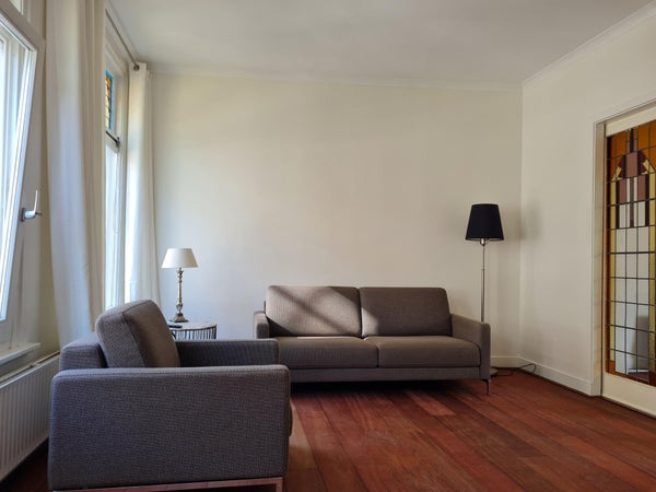 Luxueus gemeubileerde bovenwoning gelegen op een toplocatie in het historische centrum van Haarlem, in 2018 geheel gerenoveerd. Indeling Entree, 1e verdieping: overloop, sfeervolle woonkamer en eetkamer “en-suite” voorzien van een fraaie houten vloer en gescheiden door traditionele glas in ...