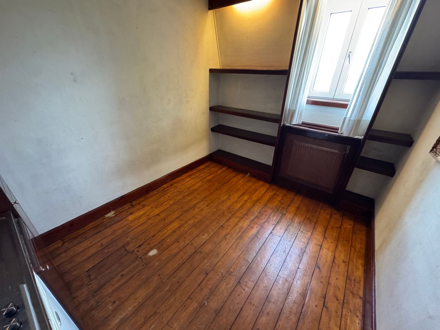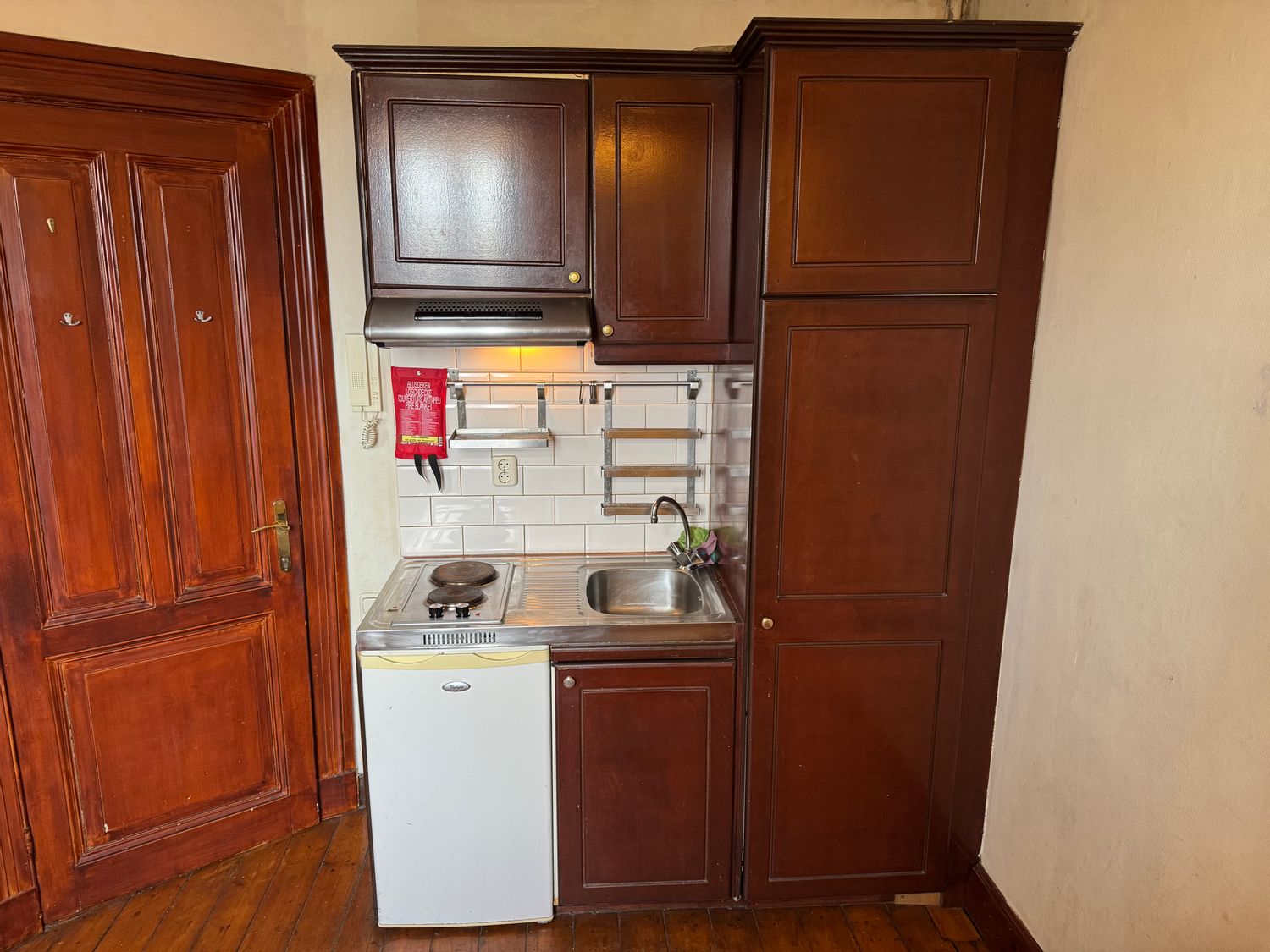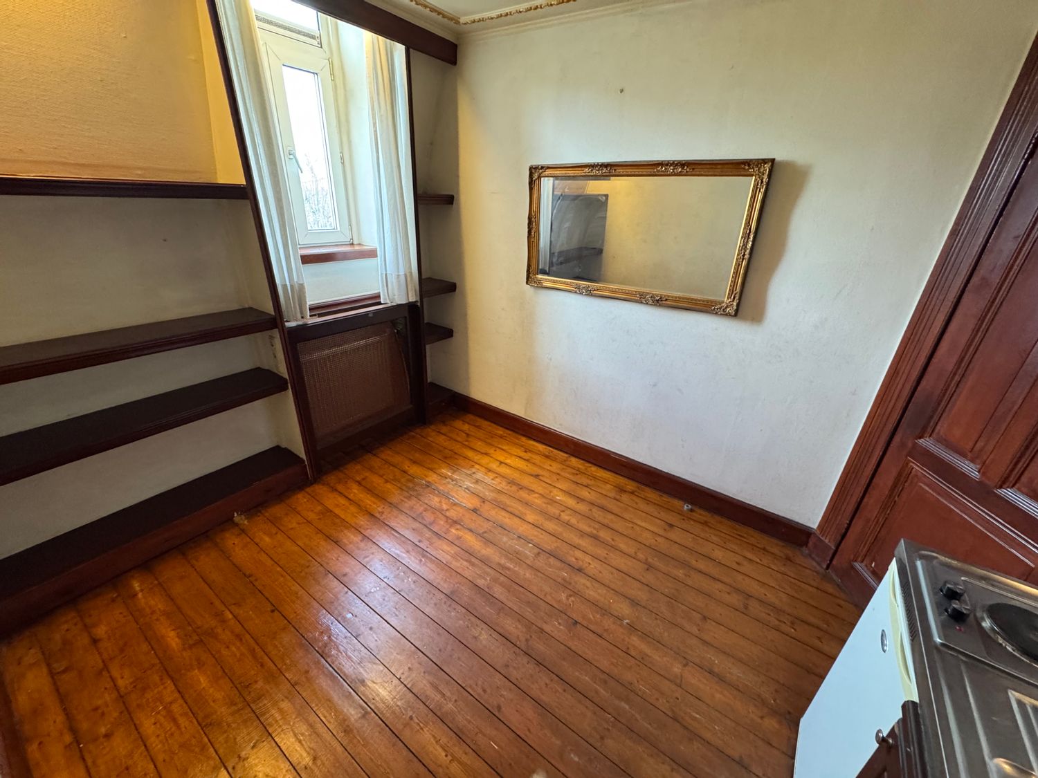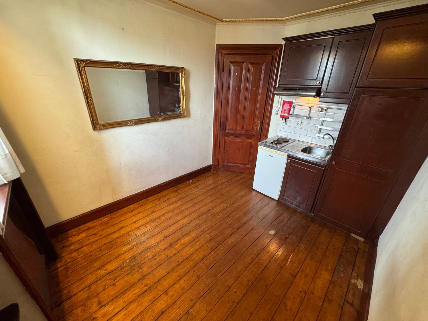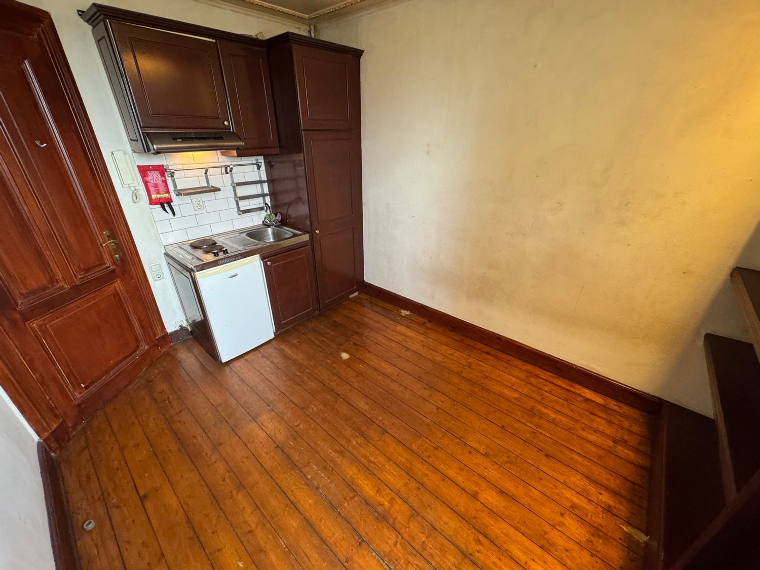 Deze kamer is gelegen op de derde verdieping en biedt een eigen keukenblok met essentiële apparatuur, waaronder een afzuigkap, elektrische kookplaat en koelkast. De badkamer, met douche en vaste wastafel, is gemeenschappelijk, net als het aparte toilet. De achtertuin is ook gezamenlijk beschikbaar ...Overdracht