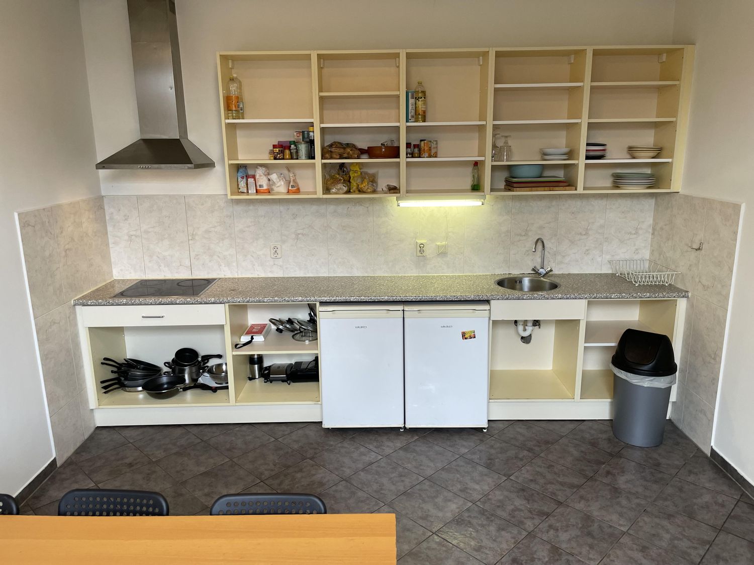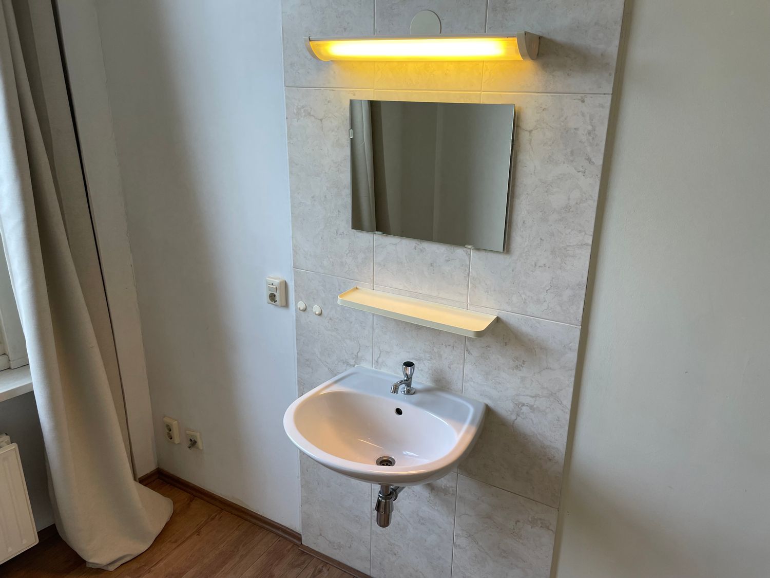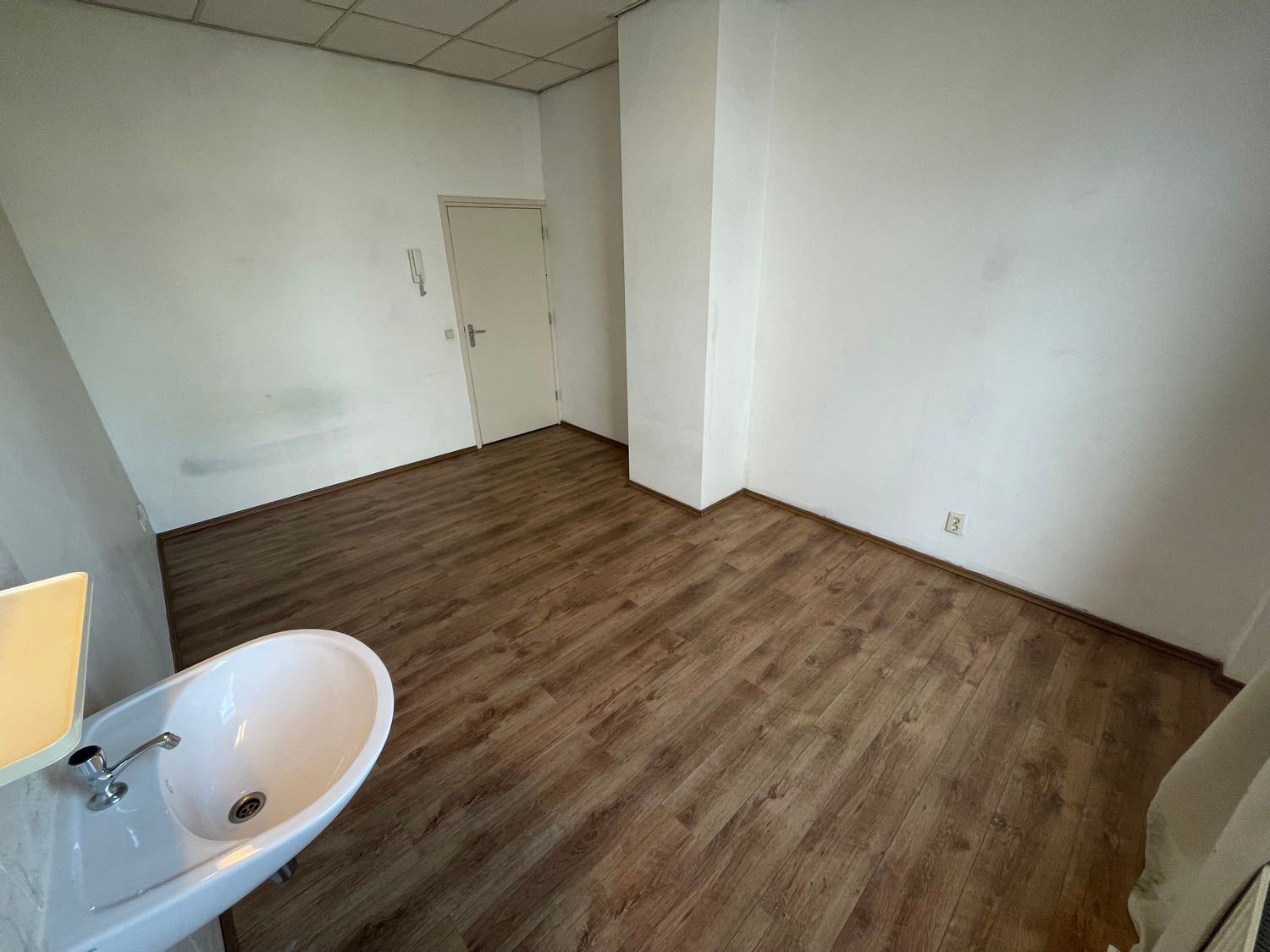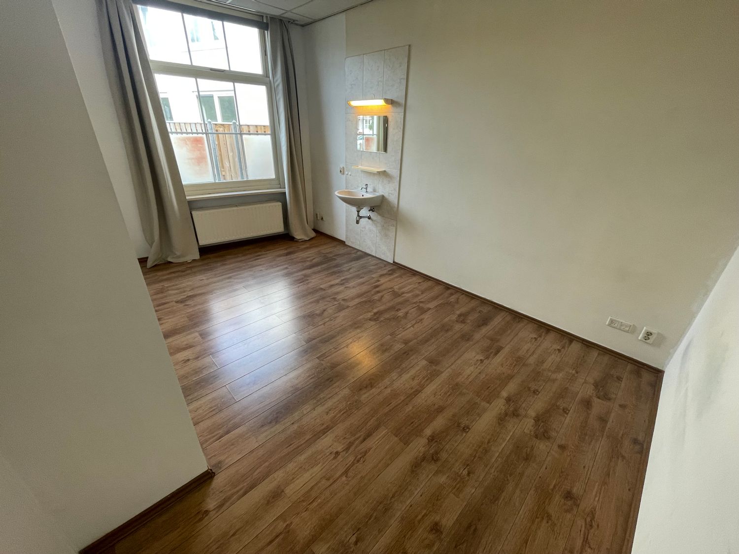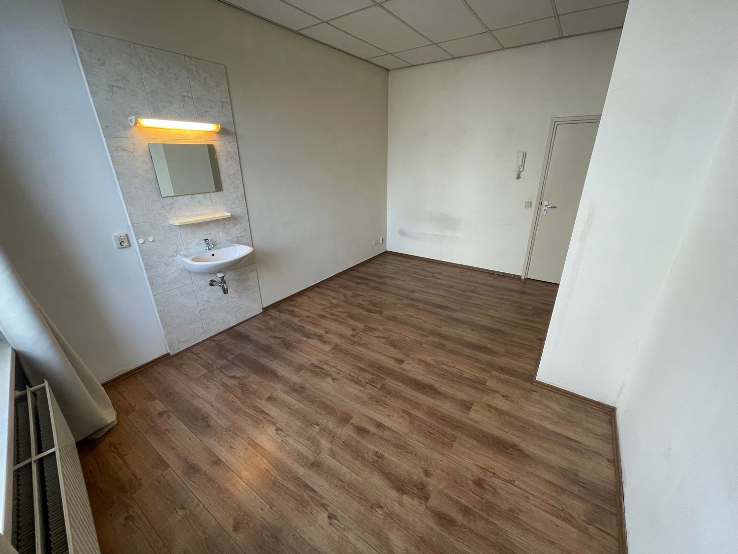 In deze kamer vind je een vaste wastafel en een laminaatvloer, omringd door gordijnen die privacy bieden. De woonkeuken wordt gedeeld met zes medebewoners en er zijn twee gezamenlijke badkamers, elk met twee douches en twee toiletten. De buitenruimte en fietsenstalling zijn ook beschikbaar. Deze ...Overdracht