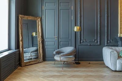 Diepe kleuren zoals wijnrood en nachtblauw zorgen voor een chique en luxe sfeer. Ook dragen klassieke sierlijsten uit de jaren ‘20 bij aan deze sfeer. Voor een chique look, wordt dit gecombineerd met glanzende materialen en opvallende patronen. De welbekende visgraatvloeren voegen een modern randje toe aan deze klassieke stijlen.